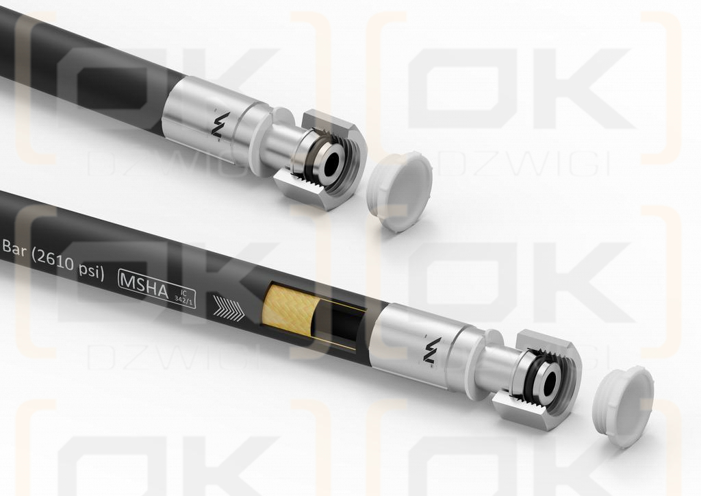 Manguera hidráulica lisa con junta Waryński PERFECTA-SMOOTH 180 bar (18MPa): manguera forjada lisa, flexible y multifuncional reforzada con una sola trenza de alambre de acero. Probado con presión de pulsación (medio: aceite hidráulico). La manguera hidráulica lisa con junta PERFECT-SMOOTH Waryński tiene protección en forma de tapones amarillos en los extremos forjados (tuercas con cono y junta tórica - mayor estanqueidad). Gracias a esto, no entran contaminantes en las líneas que podrían dañar los elementos de trabajo del sistema hidráulico. Todos los tapones están roscados y atornillados en el tipo apropiado de extremo de manguera hidráulica. Las mangueras son resistentes al fuego y están aprobadas por la MSHA estadounidense (US MSHA Approver).
